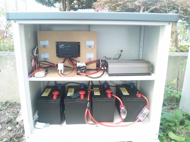 家の裏に小型物置を設置、バッテリー4個とチャージコントローラー、インバータを設置